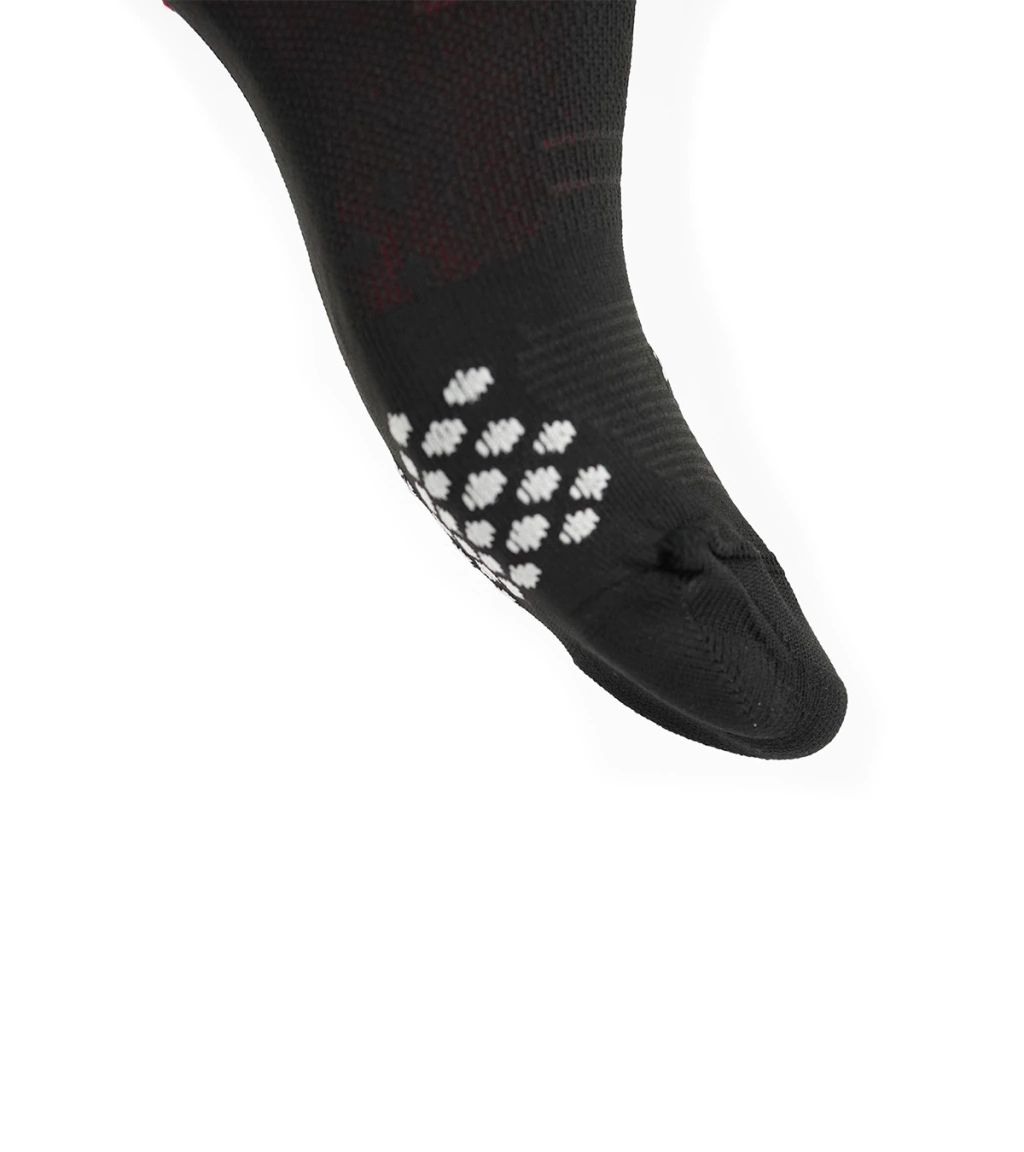 Medias de compresión pensadas para el deportista. Desarrolladas para contribuir a la re-circulación del sistema sanguíneo y a la contención de los músculos. Colaboran en la prevención de la fascitis plantar por la compresión transmetatarsal. Puño doble elastizado con protección lateral para evitar roces, caña y